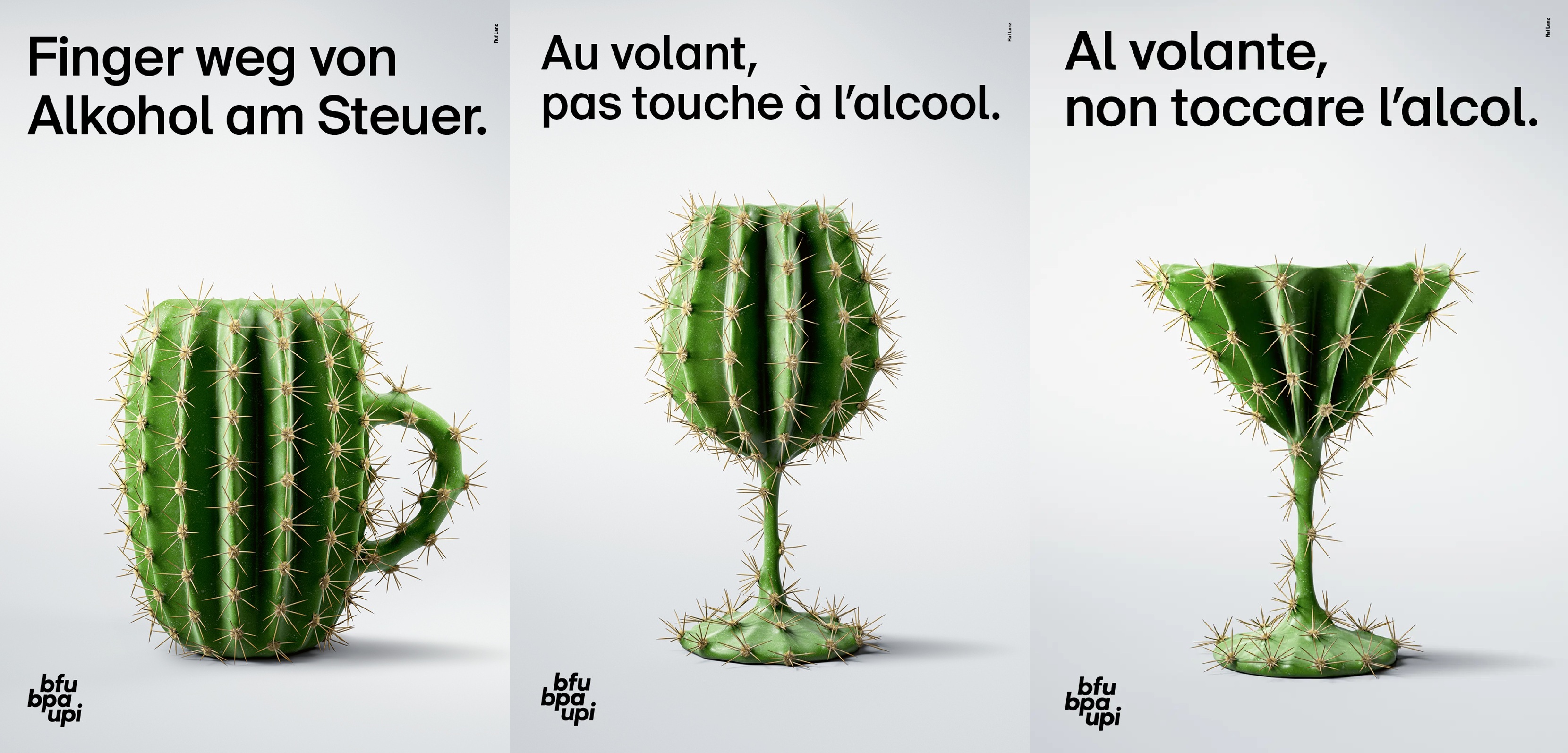 Le BPA lance donc une nouvelle campagne afin de rappeler les risques de l’alcool au volant et de réduire le nombre d’accidents liés à l’alcool. Un visuel marquant montre des verres à boissons alcoolisées se transformant en cactus épineux. Il s’agit de sensibiliser au fait que consommer des boissons en apparence inoffensives peut vite avoir des conséquences graves sur la route. Le message est clair: l’alcool et la con-duite ne font pas bon ménage; surtout en cette période où l’on trinque allègrement, mais où les routes hi-vernales et la faible luminosité appellent à la plus grande vigilance. D’où la règle d’or : au volant, pas touche à l’alcool.
